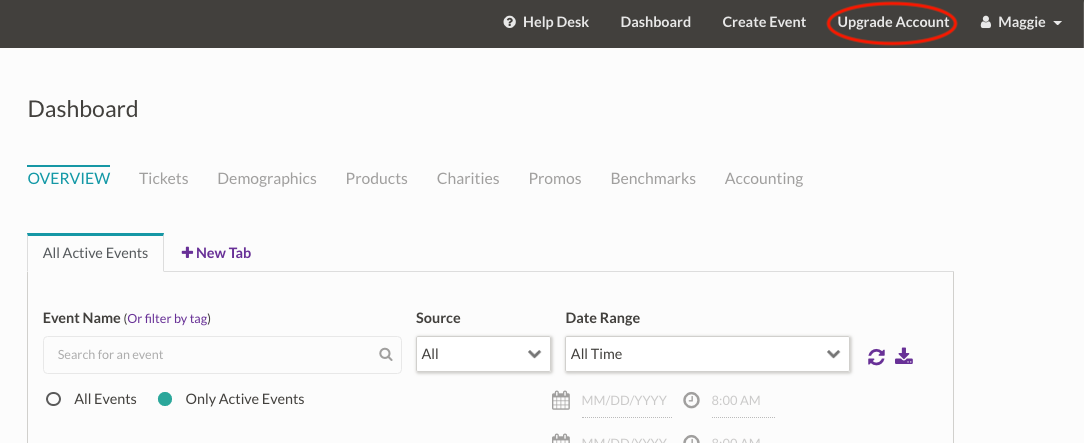 I want to charge for my event. How do I upgrade my account to charge my attendees?