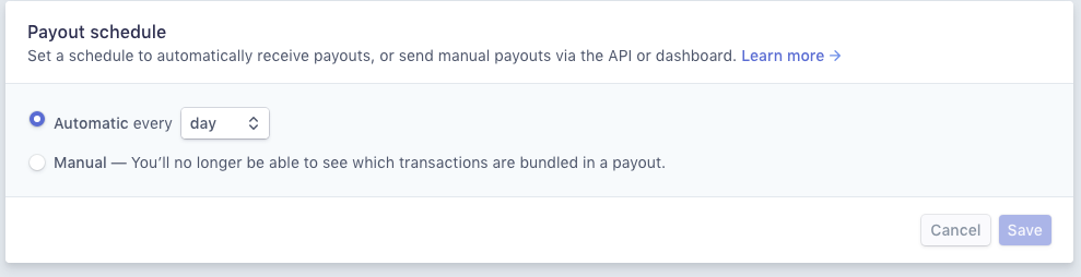 Once your account is upgraded, please make sure you have your "payout settings" set up properly. Your payout settings determine how often Stripe will send you deposits from your ticket sales. Daily deposits do NOT always start and stop at the same time, so please make sure you are willing to receive deposits that rapidly. To edit your payout schedule, select "Settings" on the left hand side of your Stripe account and then select "Payments and Payouts." From there, you can edit the payout schedule.