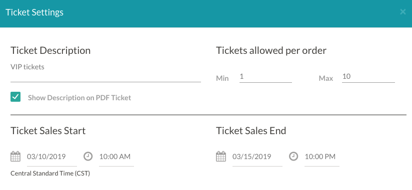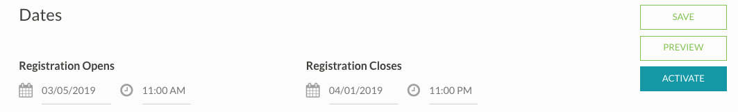 While in the "Event Details" tab of your event, you can change the dates that tickets are on sale under “Dates.” As long as your event is active and the current date is within the “Registration Opens” date and “Registration Ends” date, your tickets will be on sale. Once the Registration End Date passes your event will no longer be accessible to anyone other than you.