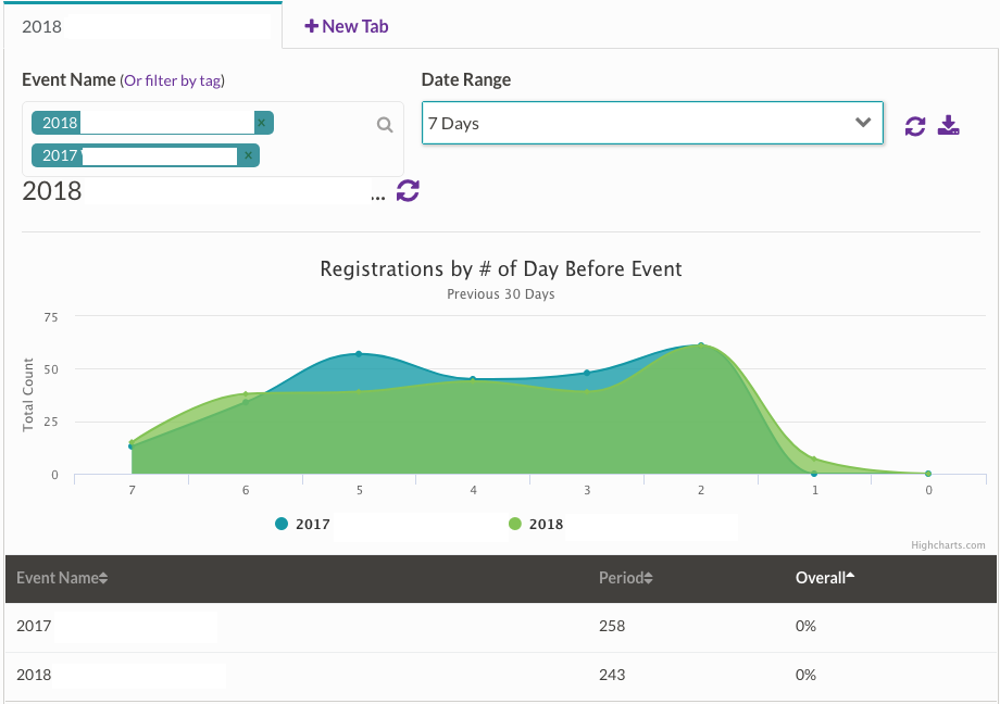 As an example, below you can see daily ticket sales 7 days leading up to a 2017 event and the following year’s 2018 event. These reports can be useful for marketing plans and sales retrospectives.
