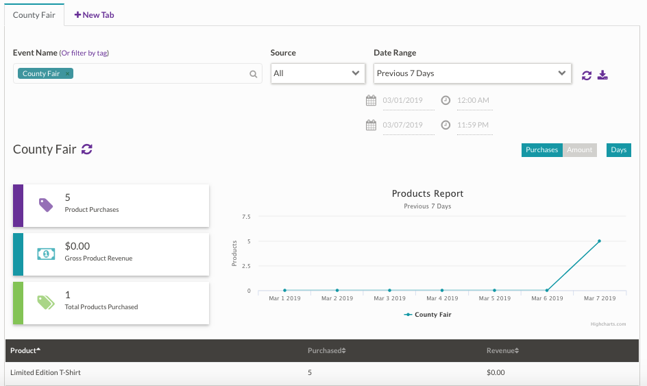 The products tab mimics your main sales tab reports on any additional products you are selling during registration, such as event merchandise. You can use this to get a quick snapshot of total product sales and revenue per product. Similar to all tabs on the dashboard, you have the ability to adjust the date range for the report.